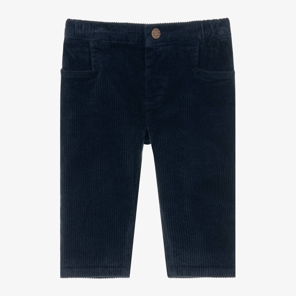 Smart-casual navy blue trousers for little boys by French brand Carrément Beau. Made in soft cotton corduroy, they have an elasticated waist for a comfortable fit. There are useful pockets at the hips, with a metal logo popper to fasten on the front.