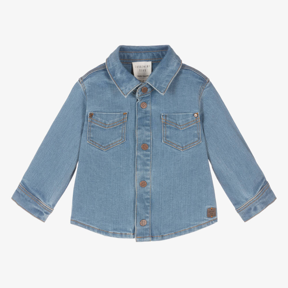 Cute blue cotton denim shirt for little boys by classic French brand Carrément Beau. With a washed and worn look, it has bronze-coloured rivets on the chest pockets, with matching logo popper fastenings on the front and cuffs. With mustard yellow overstitch detailing, the hemline is curved and there is an inverted pleat on the back. A metal logo tab is sewn on one side.