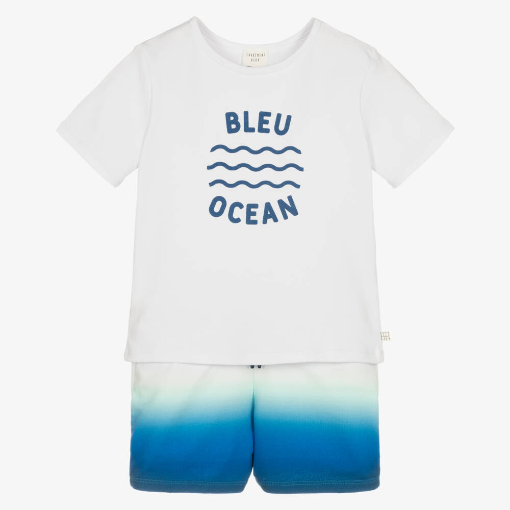 White and blue shorts set for younger boys by Carrément Beau, made from soft organic cotton jersey. Casual in style, the white T-shirt has a rounded neckline and a blue slogan print on the chest. The coordinating shorts come in a blue ombré design flowing from white to blue. They are elasticated at the waist with fixed drawstring ties.