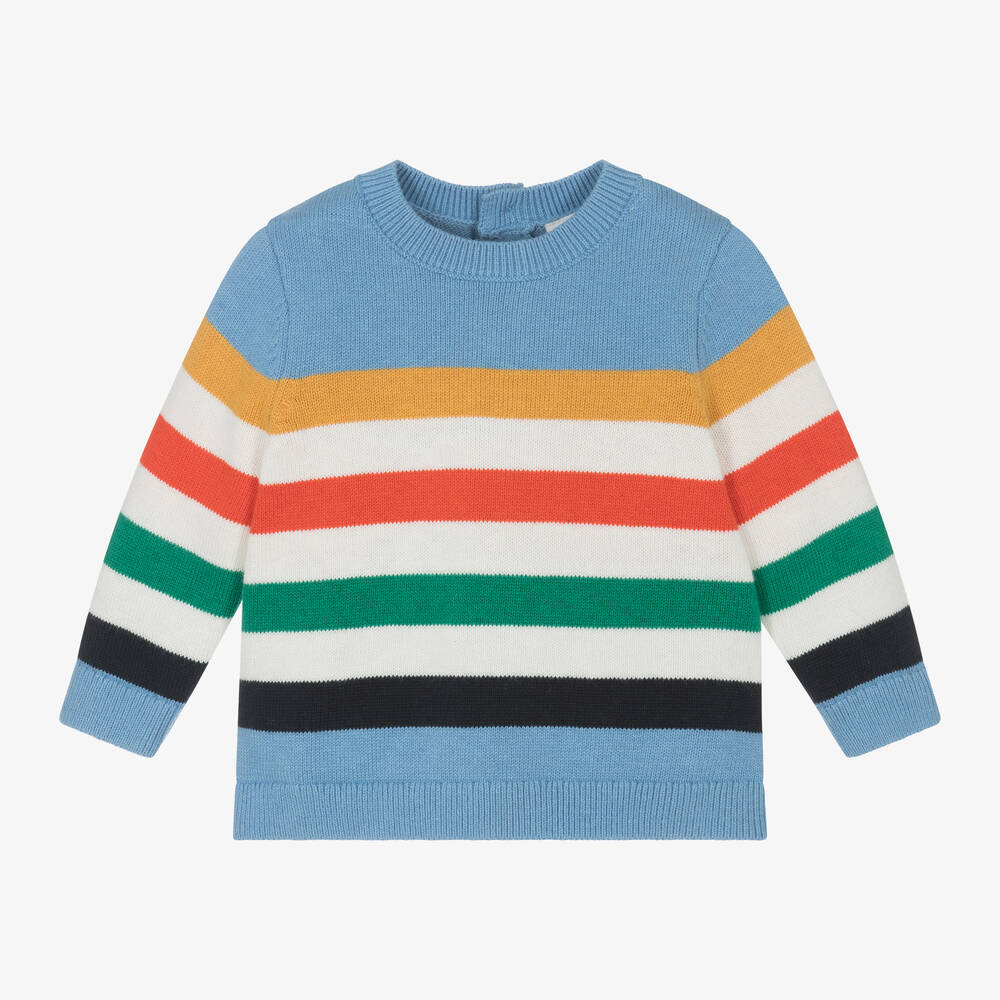 A blue striped jumper for little boys by Carrément Beau. This eye-catching crew neck top is knitted in a super soft organic cotton and wool blend with a multi-coloured stripe design adding a touch of colour on cooler days. There are button fastenings on the back to help with over-the-head dressing.