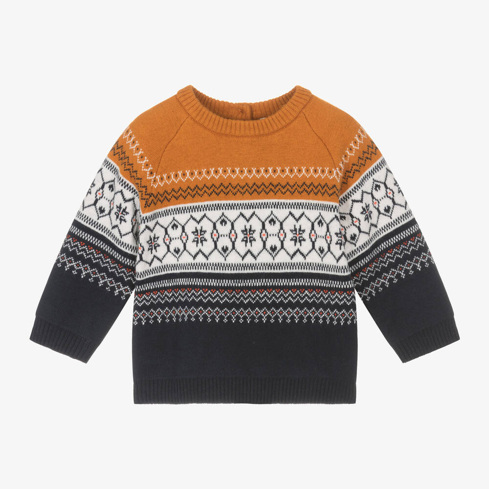 Featuring a classic Fair Isle pattern, this lovely navy blue, white and orange sweater for little boys is by French brand Carrément Beau. Knitted in a beautifully soft cotton and wool blend, this cosy top has ribbed trims and back button fastenings.