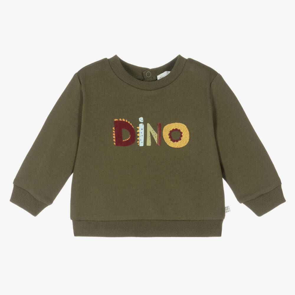 Khaki green sweatshirt for little boys by Carrément Beau, made from soft and mid-weight organic cotton jersey. Lined with soft fleece, it has a rounded neckline and cosy ribbed trims for comfortable wear. It has a colourful 'dino' slogan on the front with fun embroidered details. There are easy popper fastenings on the back and a branded tab stitched on the side seam.