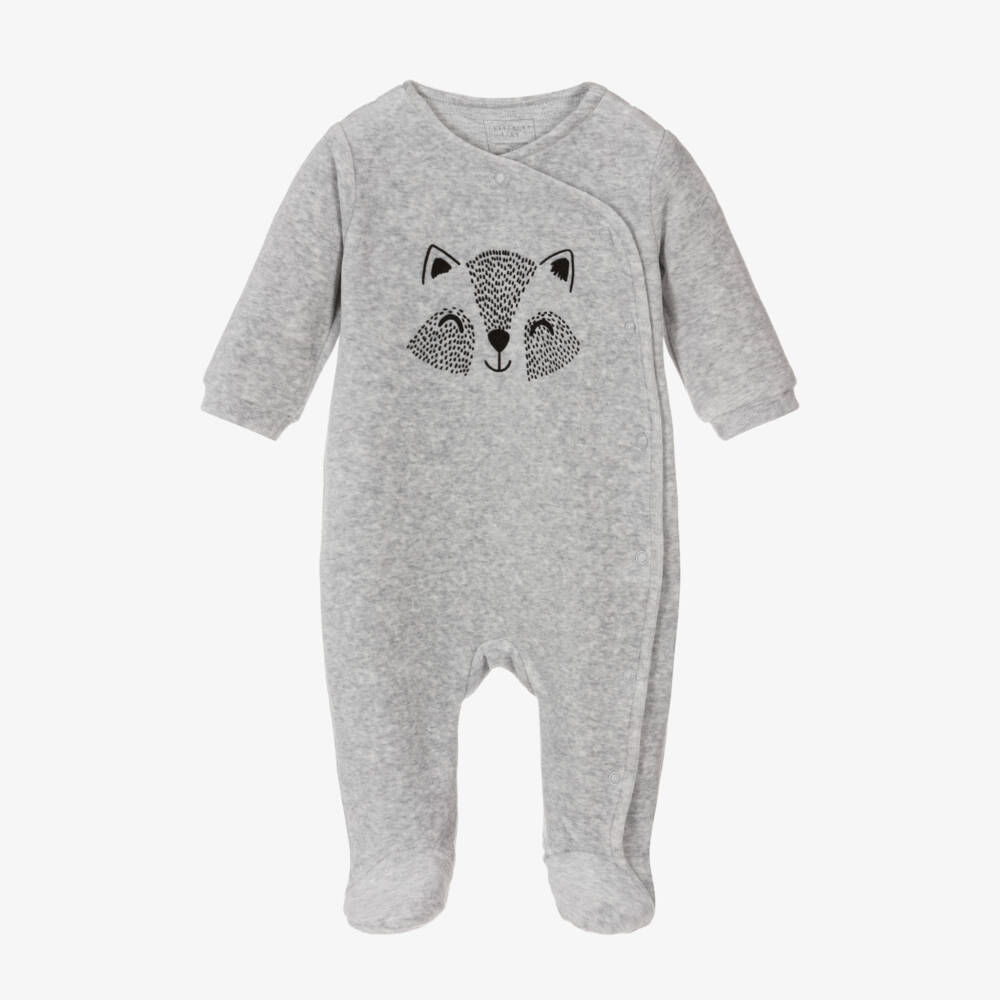 Light grey velour babygrow for boys by French brand Carrément Beau, made in soft organic cotton blend. Gentle against delicate skin, it has a quirky textured raccoon graphic printed on the front. It fastens with convenient poppers on the front for quick and easy dressing.