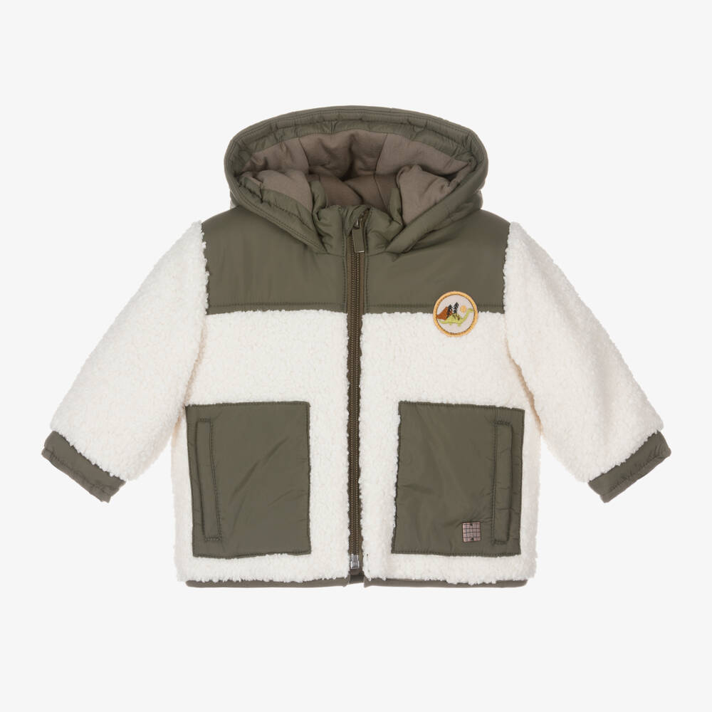 Little boys khaki green and ivory colour block coat by Carrément Beau. In a beautiful soft sherpa fleece with silky smooth trims, it has a fun dinosaur appliqué on the chest. This stylish coat is lightly padded for warmth and has a comfortable jersey lining, an easy-grip zip puller with a protective chin guard, and two front pockets to keep little hands warm.