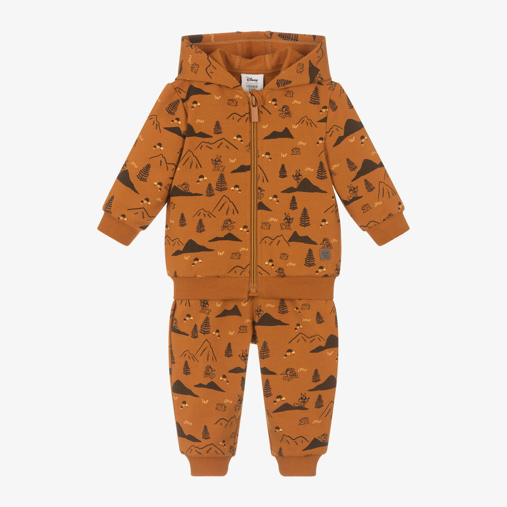 A brown-orange tracksuit for boys by French brand Carrément Beau, with a cute all-over print of Disney's Thumper rabbit. Casual and comfortable, it is made in soft organic cotton jersey with a cosy fleece inside. The zip-up top is hooded and the joggers have a gently elasticated waistband.
