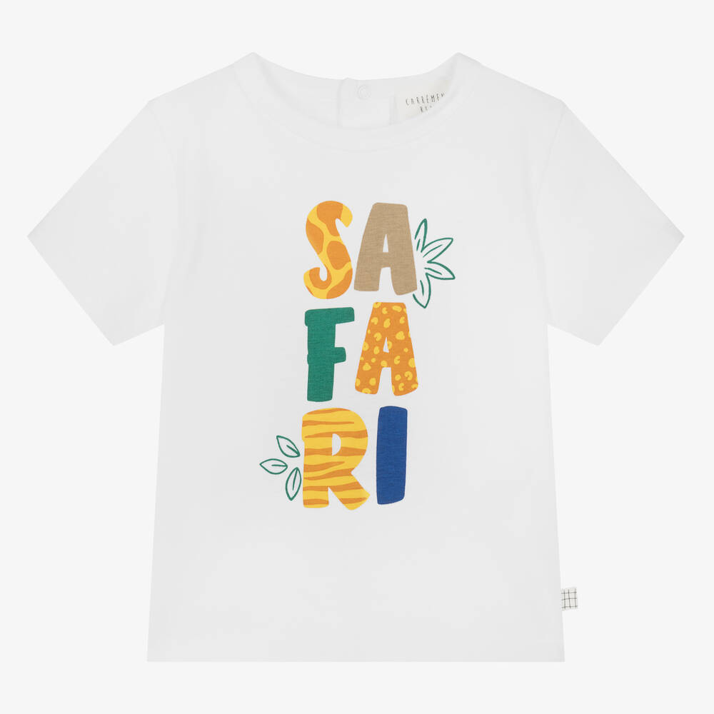 A white T-shirt for younger boys by French brand Carrément Beau, made in soft organic cotton jersey. This comfortable tee has a crew neck and short sleeves, with a 'Safari' motif on the front, designed in fun animal prints. Smaller sizes have poppers on the back to help with dressing.