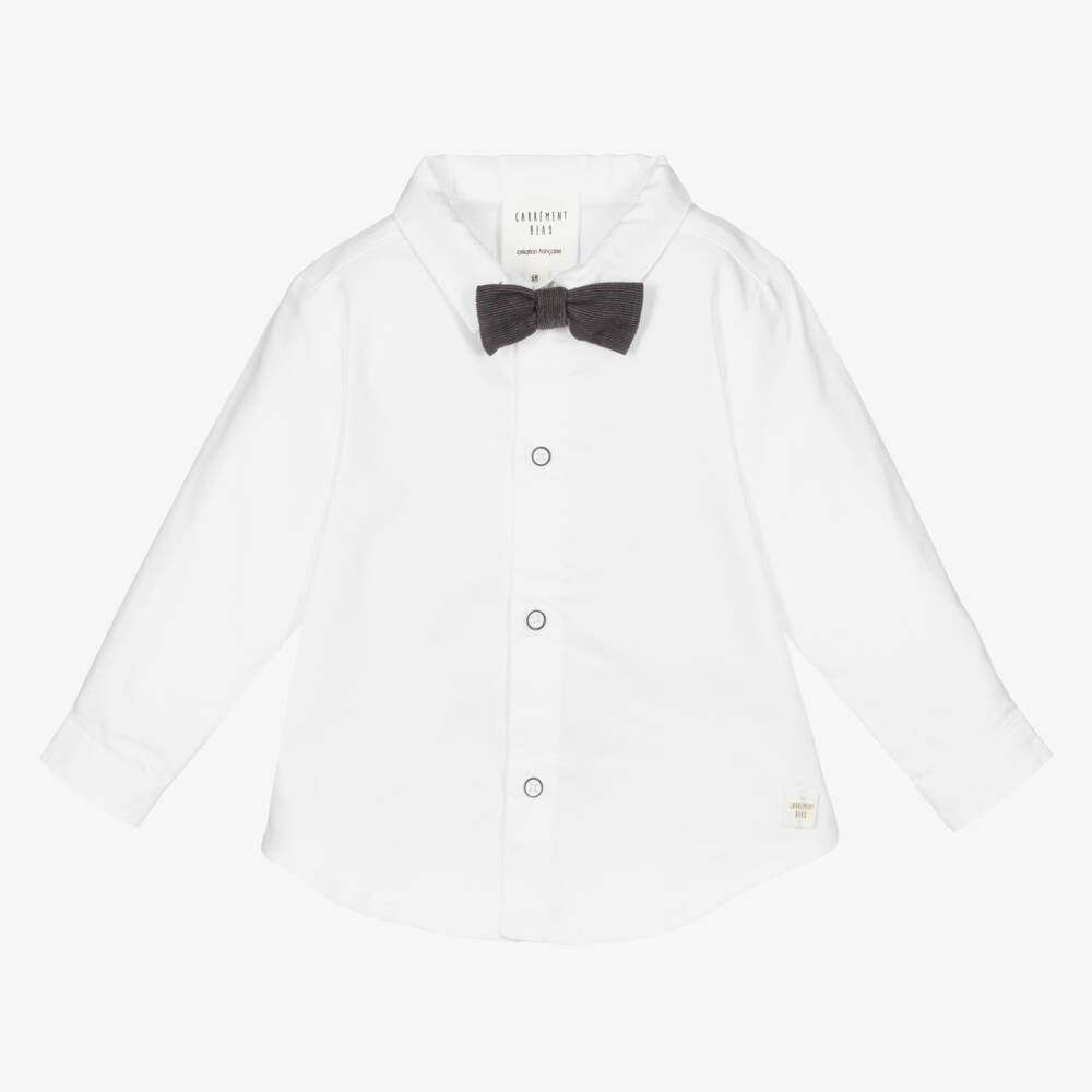 Smart white shirt for little boys by Carrément Beau, made in soft cotton with a linen feel. It comes with a grey corduroy bow tie and fastens with grey trimmed buttons down the front.