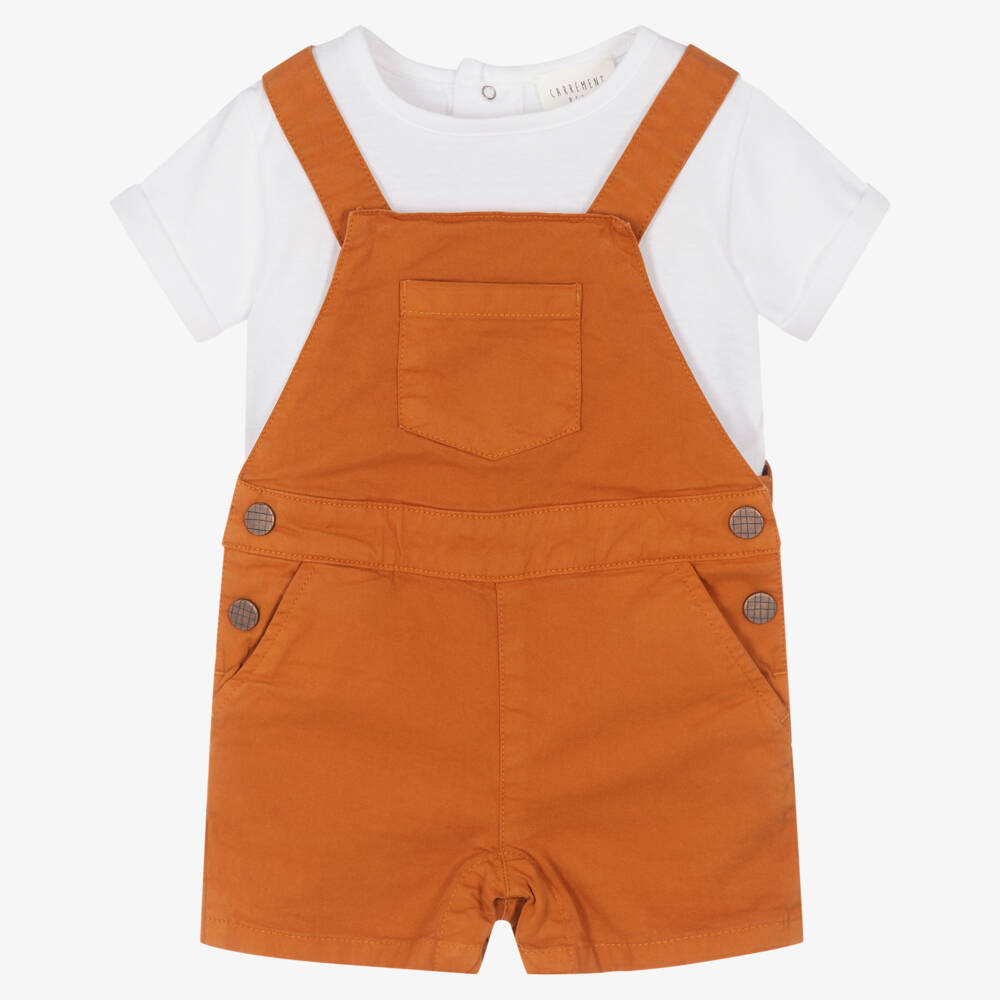Soft and comfortable for little boys, this classic top and dungaree shorts set is by French brand Carrément Beau. The white T-shirt is made in stretchy cotton jersey, with popper fastenings on the back. Made in smooth cotton twill, the caramel brown dungaree shorts have useful pockets on the front and fasten easily with poppers at the sides.The shoulder straps are adjustable and secure with button fastenings on the front.