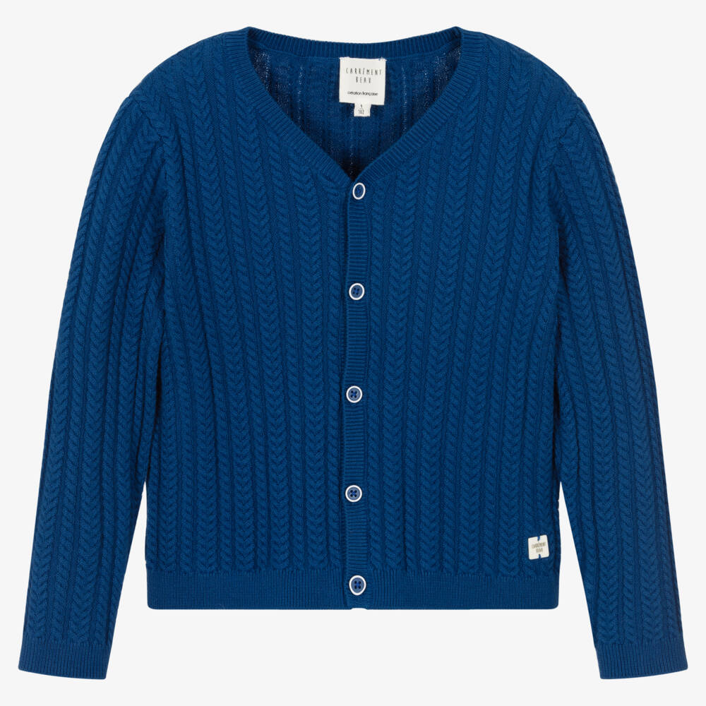 A timeless dark blue cardigan for little boys and girls, by Carrément Beau. Finely knitted in beautifully soft organic cotton, this cardigan features a miniature cable knit pattern for a classical style. There are white trimmed button fastenings, with a coordinating charm logo on the hem.