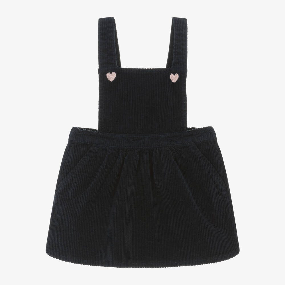 A cute navy blue pinafore dress for little girls by Carrément Beau, made in beautifully soft cotton corduroy. The bib front has sweet embroidered hearts on each side and adjustable shoulder straps for a good fit. Gently elasticated at the waist, the full skirt has sweet front pockets.