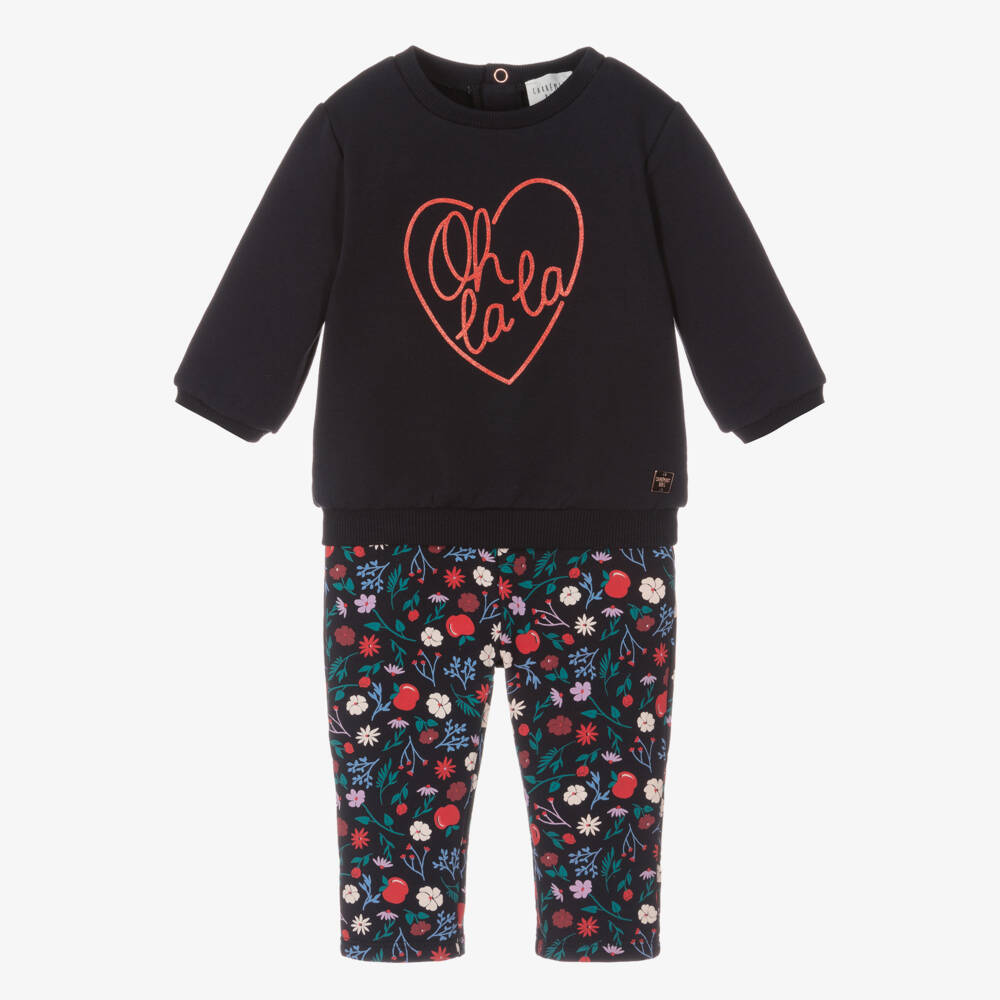 Sweet navy blue cotton tracksuit for little girls by classic French brand Carrément Beau. Just right for relaxed days, it is made in comfortable jersey with a soft, brushed inside. The sweatshirt has a glittery red heart printed on the front, with 'Oh la la' written inside. There is a rose gold metal logo tab by the hemline, neat, ribbed trims and logo popper fastenings on the back. The coordinating joggers have a lovely apples and flowers print in red, lilac and white, and a stretchy, elasticated waistband.