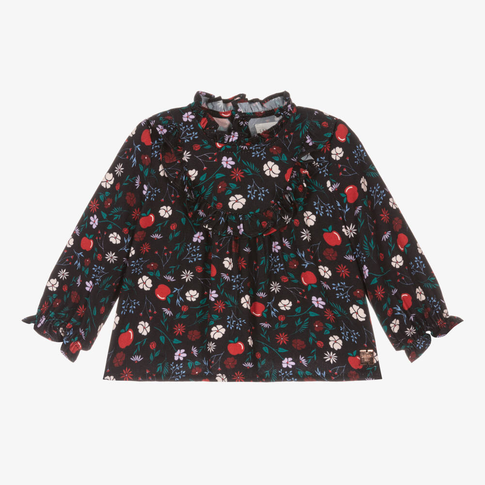 Navy blue viscose blouse for little girls by French brand Carrément Beau. Made in soft twill, it is patterned with apples and flowers in red, lilac purple and white. It has a frilled neckline, with matching frills on the bodice and elasticated cuffs. It has a rose gold metal logo tab sewn by the hemline and fastens on the back with easy poppers.