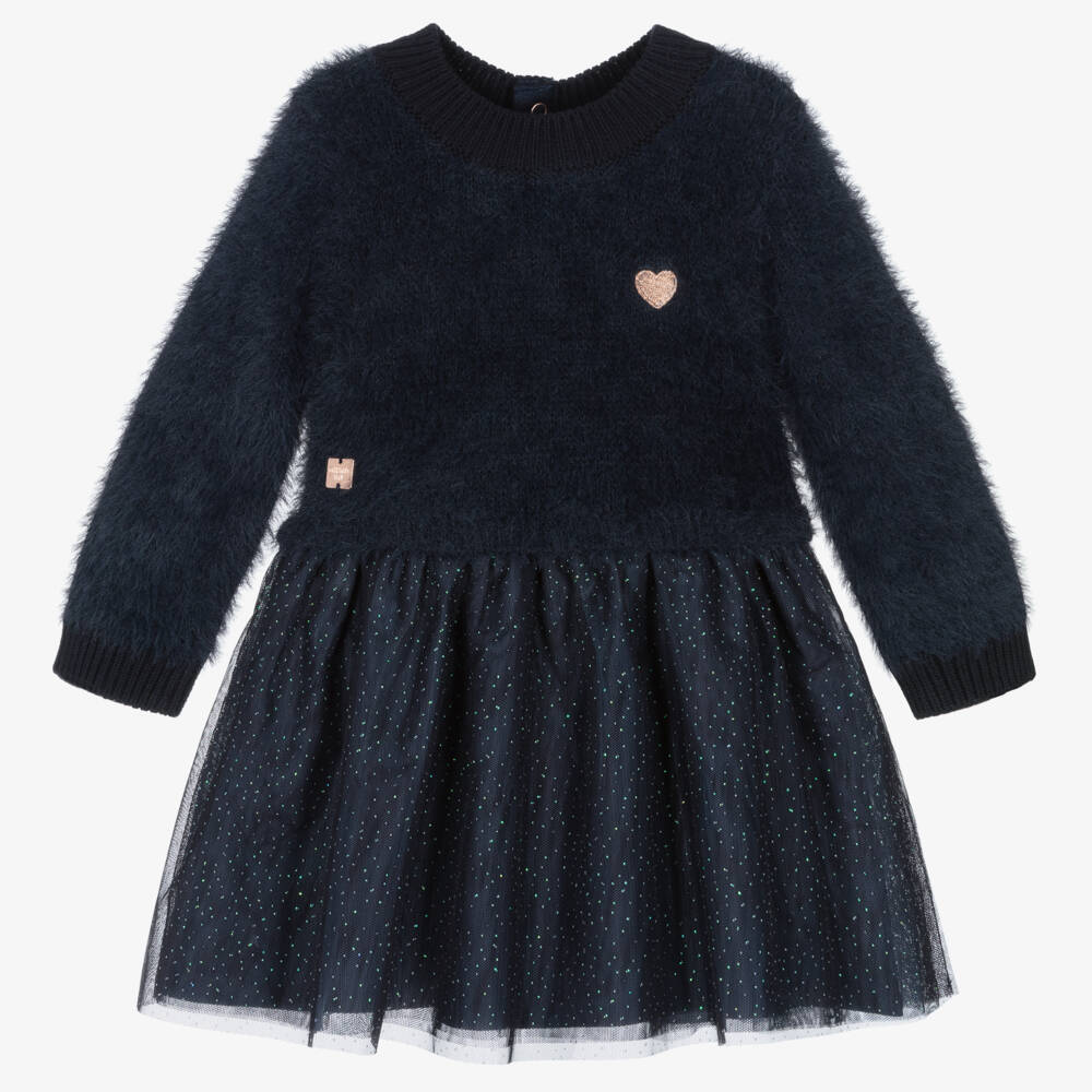 Navy blue dress for little girls by classic French brand Carrément Beau, just right for a party. The fluffy, knitted bodice is warm and cosy, with an embroidered gold heart on one side, a rose gold metal logo tab on the other side and neat, ribbed trims. The top layer of tulle on the gathered, full skirt sparkles with green and navy blue glitter. There are further layers of tulle below and a comfortable, jersey lining. It fastens with rose gold logo poppers around the back.