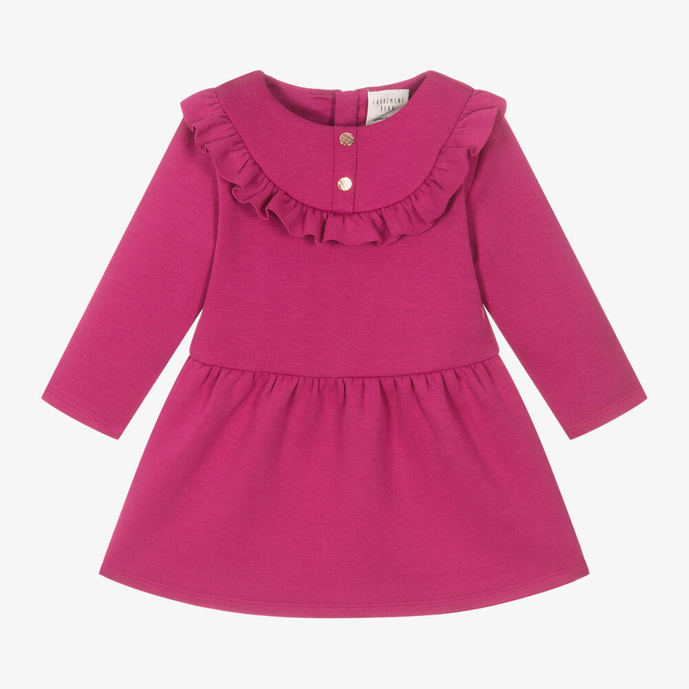 A lovely dark fuchsia pink dress for little girls by Carrément Beau, made in a soft viscose jersey blend. This long-sleeved style has a pretty ruffle trim on the bodice and decorative rose gold buttons below the neckline. The dress has a gathered waist seam and a neat zip fastening on the back.