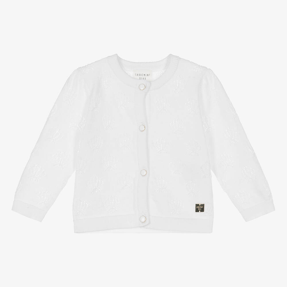 Pretty white cardigan for girls by classic French brand Carrément Beau, with a pointelle knit shell pattern. It has feminine, puffed shoulders and is made in lightweight cotton with glittery, iridescent thread. The cardigan has long sleeves, neat, ribbed trims and fastens on the front with white enamelled buttons trimmed in gold. A coordinating gold logo badge is sewn by the hemline.
