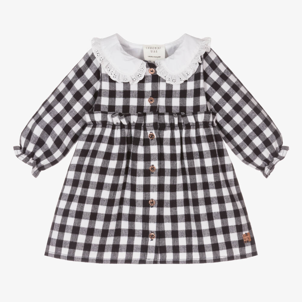 Navy blue and white checked dress for little girls by French brand Carrément Beau. Made in super soft, brushed cotton, it has a white poplin collar trimmed with pretty cutwork flowers and a scalloped edge. The lovely frill on the waistline and the gently elasticated cuffs create a cute and girly look. Fully lined in lightweight voile for comfort, it fastens with rose gold logo buttons on the front.