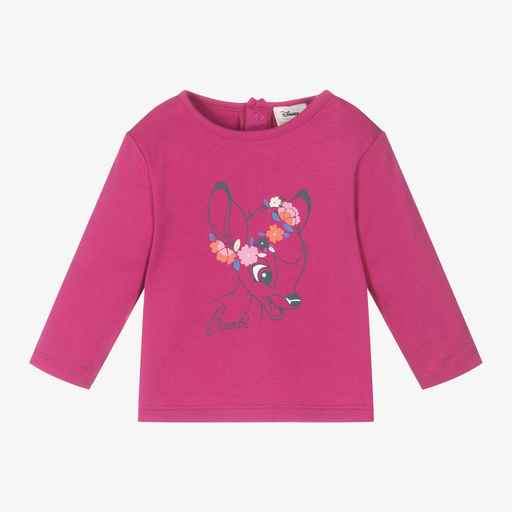 A bright fuchsia pink top for little girls by French brand Carrément Beau. An adorable motif of Disney's Bambi is featured on the front, embellished with pretty flowers in pink, orange and gold. Made in soft organic cotton jersey, this casual tee fastens easily with poppers on the back.