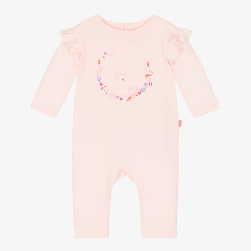 A lovely pale pink romper for baby girls by French brand Carrément Beau. It has pretty ruffles over the shoulders and a sparkly floral design printed on the front, with the word 'Jolie' in the centre. Made in comfortable organic cotton jersey, it fastens easily with poppers on the back.