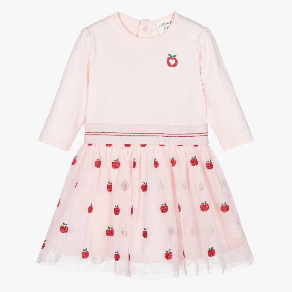 Lovely pale pink cotton dress for little girls by French brand Carrément Beau. The bodice and pretty puffed sleeves are made in a soft and stretchy jersey, with a sparkly red apple motif on the chest. The tulle skirt is patterned with sparkling red glitter apples and flares beautifully from the elasticated waistband. Fully lined with soft jersey for comfort, this gorgeous dress fastens easily at the back with popper fastenings.