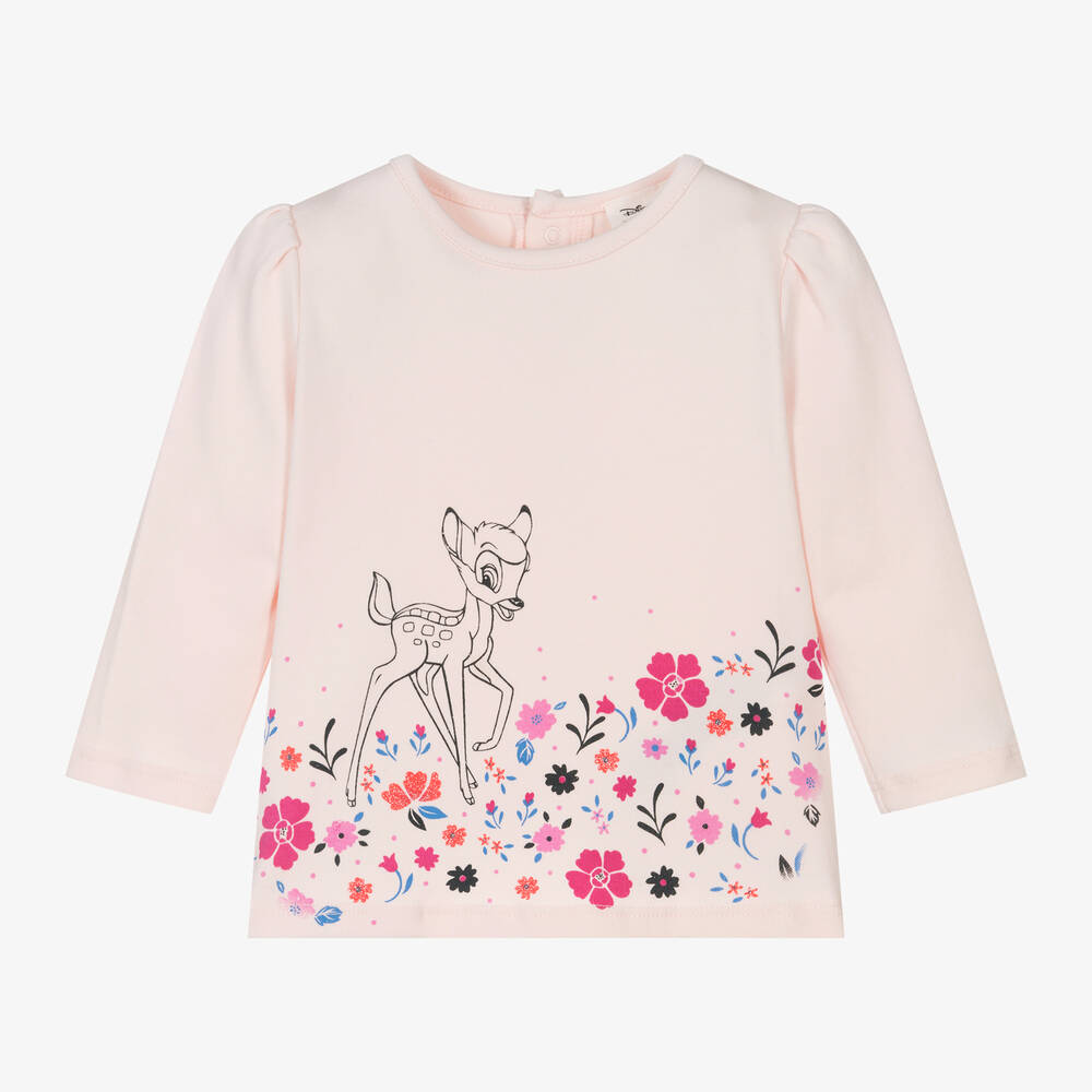 Pale pink top for little girls by Carrément Beau, made in soft cotton jersey for comfortable wear. This cute piece has long puffed sleeves and a simple round neckline. Disney's beloved Bambi is printed on the front, running through beautiful blue and pink flowers with glittery details. Poppers fasten easily on the back.