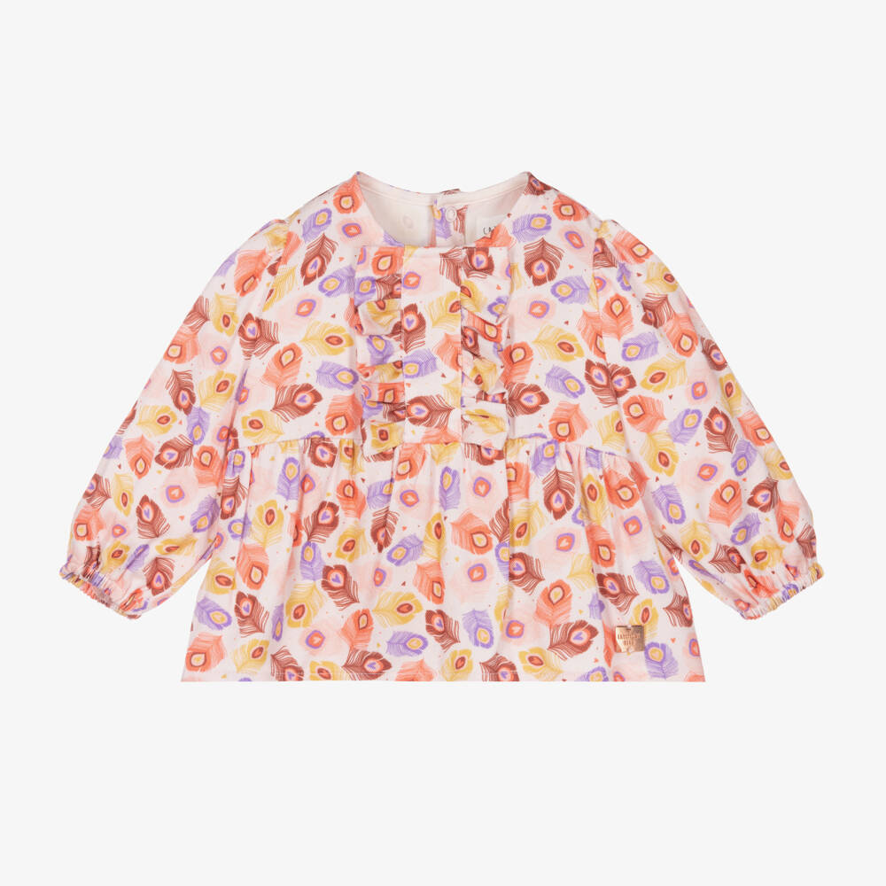 Gorgeous pink blouse for little girls by French brand Carrément Beau. Made in soft viscose twill, it has a pretty feather print in pink, yellow and purple with sweet ruffles on the bodice. The cuffs are gently elasticated and it fastens easily on the back with popper fastenings. A rose gold logo plate on the hem adds a subtle designer finish.