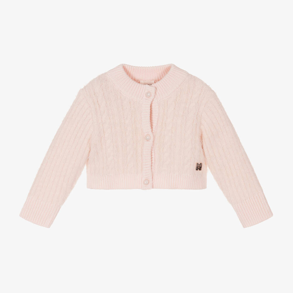 A lovely pale pink cardigan for little girls by French brand Carrément Beau. Made in a soft fluffy knit with cosy ribbed trims, it has classic cable stich detailing and sparkly button fastenings. A rose gold logo plate on the front adds a finishing designer touch.