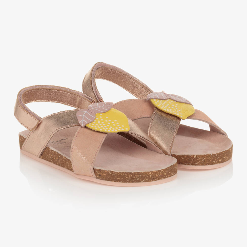 Girls pretty pink sandals by Carrément Beau, made in soft leather. The front is finished with a yellow and pink lemon on the front straps for an ultimate holiday-inspired look. They fasten with a useful velcro strap across the back for ease. They have a stylish cork mid-sole and rubberised non-slip sole for improved grip.