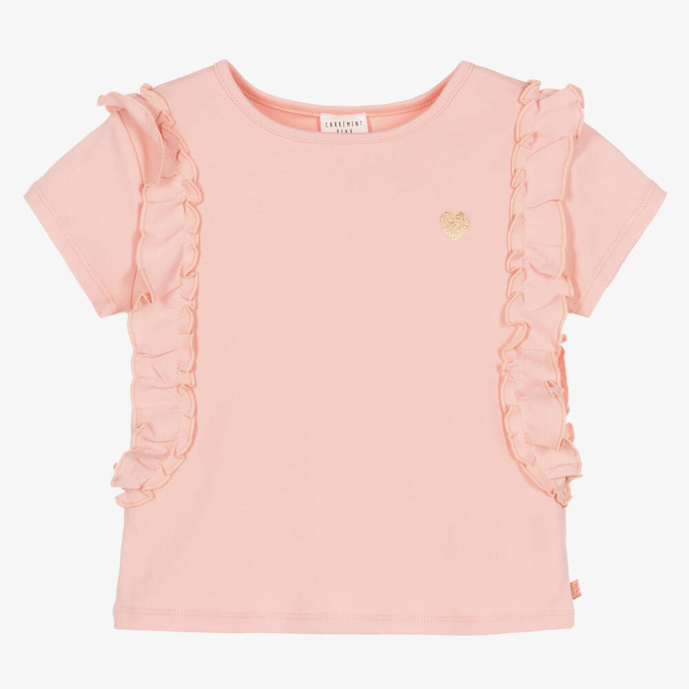 Lovely pink T-shirt for girls by Carrément Beau, made from soft organic cotton jersey. This classic style is finished with ruffle trims that run down the side of the body and over the shoulders. A metallic gold heart can be seen on the chest for a touch of sparkle. Smaller sizes have popper fastenings on the back for easy dressing.