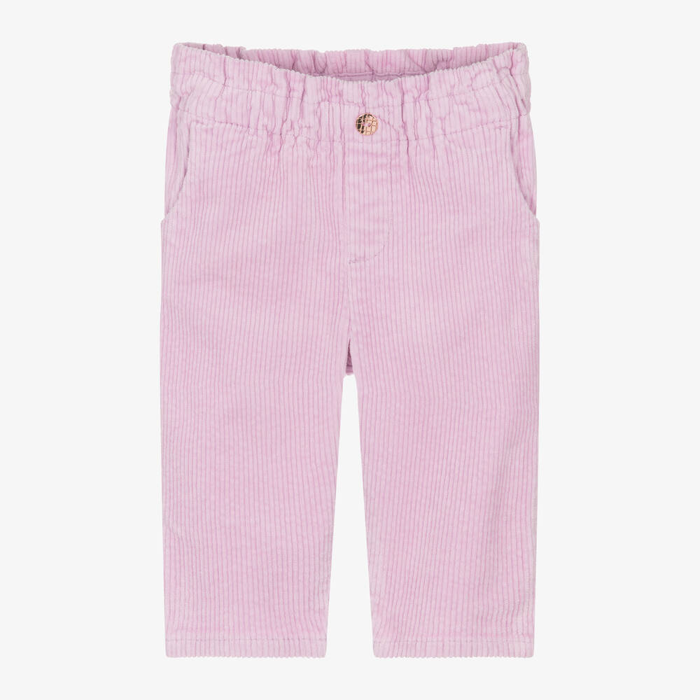 Corduroy trousers for little girls by Carrément Beau, in a lovely lilac purple shade. Made in soft cotton with a slight stretch, these comfortable trousers have an elasticated waist with a faux rose gold button detail and front pockets.