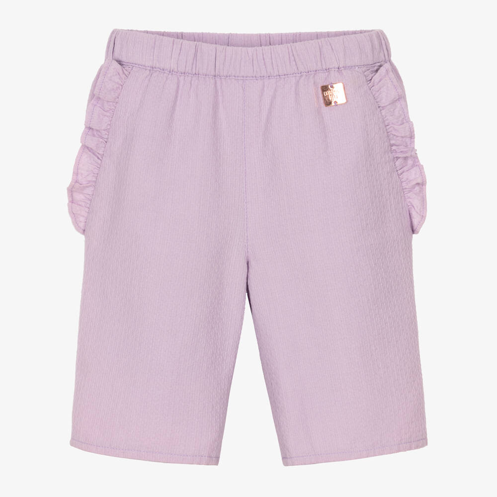 Lovely lilac purple trousers for little girls by French brand Carrément Beau, with pretty ruffle trims on the sides. They are woven in softly textured cotton, with a lightweight voile lining for comfort. The waistband is gently elasticated, and there is a rose gold branded metal plate for a subtle designer finish.