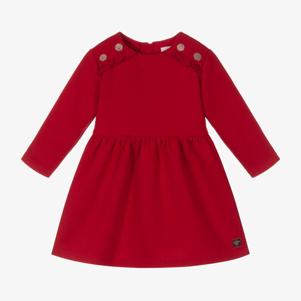 Smart red dress for little girls by classic French brand Carrément Beau. Made in soft Milano jersey, it has decorative, shiny rose gold logo buttons on the shoulders, with pretty frills. It fastens with a neat, concealed zip on the back, and has a gathered skirt with a rose gold logo tab sewn by the hemline.