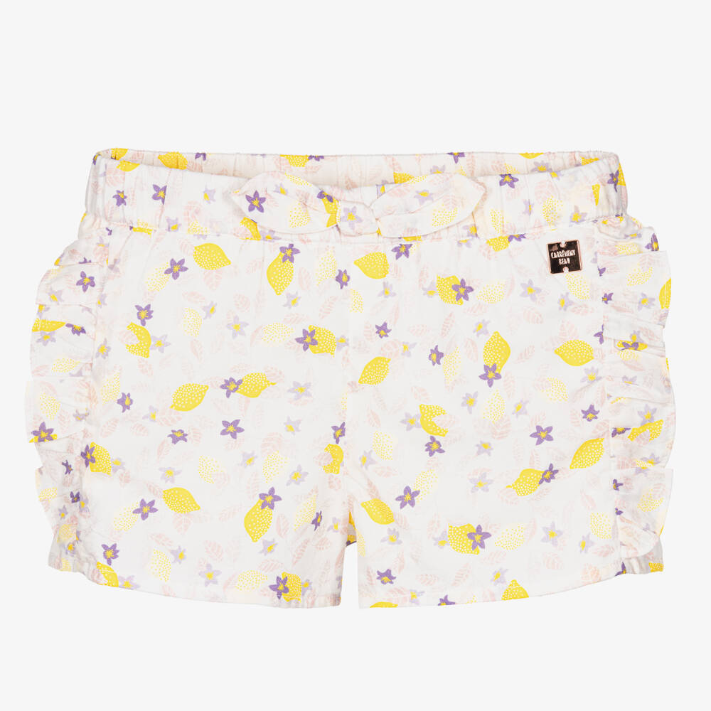 White cotton shorts for younger girls by Carrément Beau, patterned with pale pink leaves, pretty purple flowers and bold yellow lemons. Lightweight, they are styled with ruffled trims and a sweet, knotted bow on the elasticated waist. A rose gold logo plate can be seen on the front for a finishing touch.