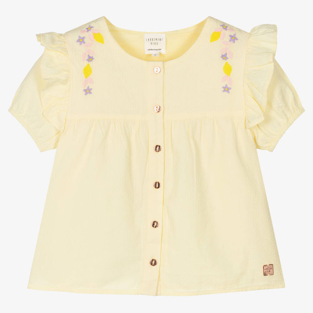 Pastel yellow blouse for girls by Carrément Beau, woven in lightweight cotton. Embroidered with pink and purple flowers on the shoulder, it has pretty puffed sleeves with flutter sleeves and a relaxed shape. It fastens with lovely rose gold poppers on the front for stylish dressing.