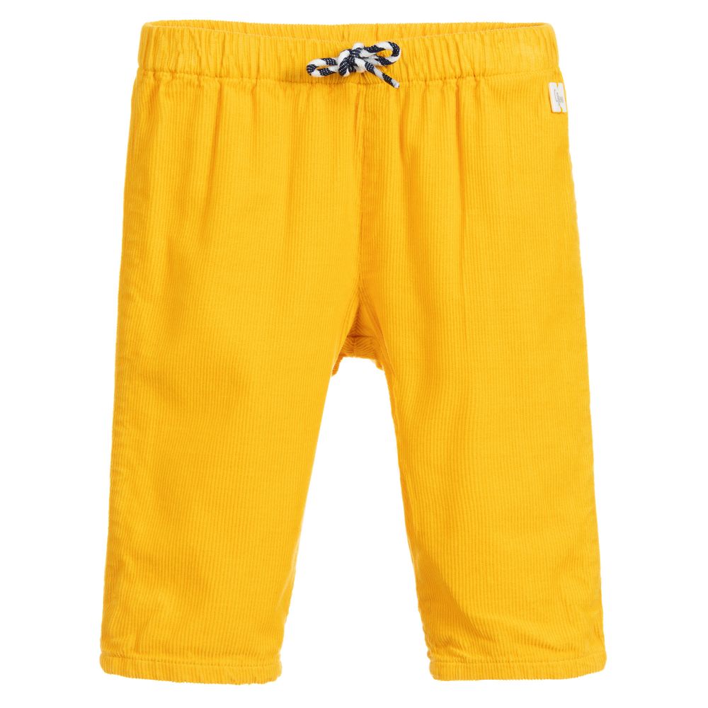 Younger boys and girls yellow trousers from Carrément Beau. They are made in soft cotton corduroy, with a lightweight cotton lining. They have an elasticated waistband, with a blue and white striped faux drawstring.