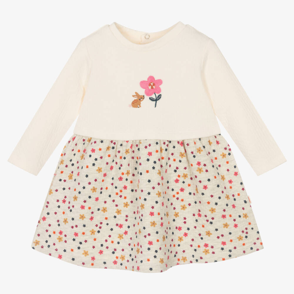Grey and ivory dress for baby girls by Catimini. Soft and comfortable, it is made in double-layered cotton pointelle jersey. The bodice is embroidered with a sweet brown bunny and a pretty pink flower on the front. The gathered skirt has an all-over floral print in pink, blue and yellow. There are popper fastenings on the back to assist with dressing.