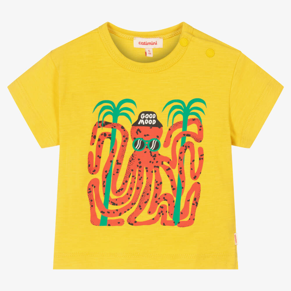 Bright yellow T-shirt for little boys by Catimini, made in soft cotton jersey. With a crew neck and short sleeves, this casual piece has a red octopus print on the front, wearing a fun slogan bucket hat. Popper fastenings on one shoulder make dressing easy. 20% minimum of the fibres in this product are recycled.