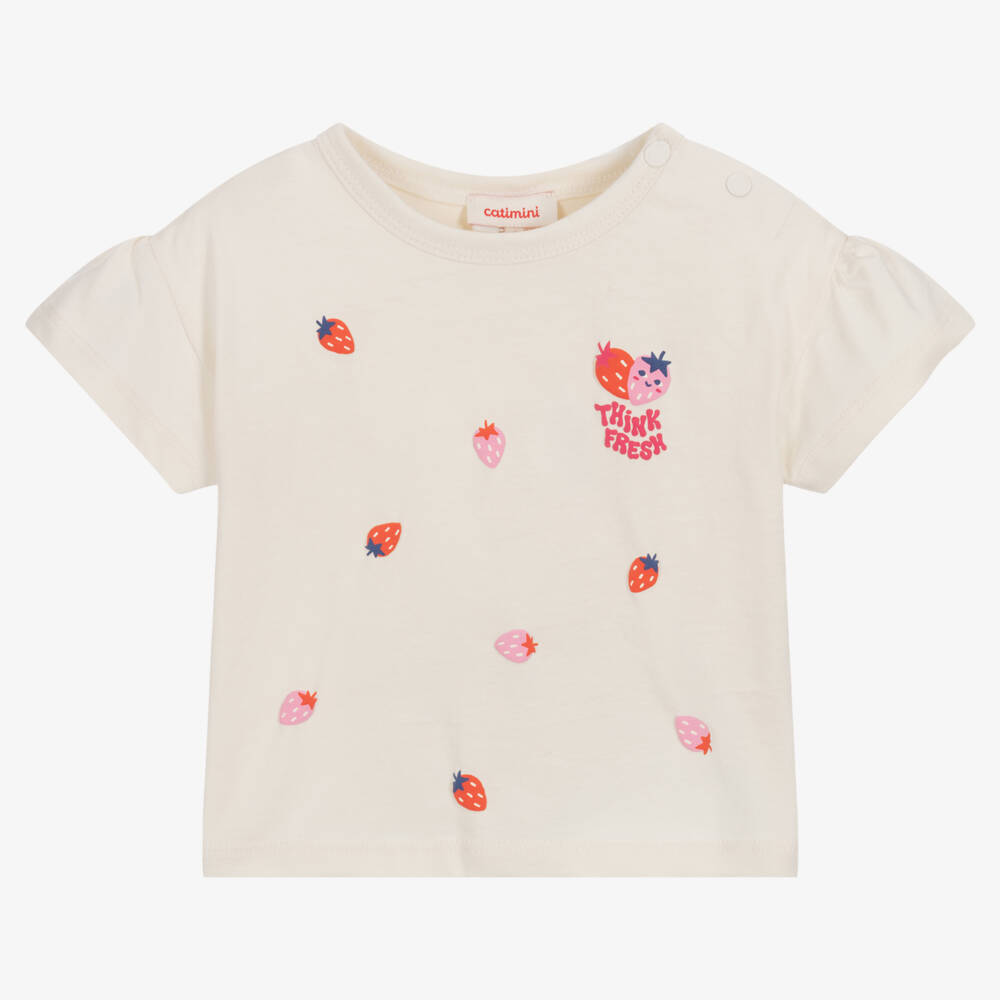 Ecru T-shirt for little girls by Catimini, made from soft cotton jersey. Fun and playful, this casual piece is designed with raised red and pink strawberry motifs on the front, as well as a 'Think Fresh' slogan on the chest. With popper fastenings on one shoulder, the short sleeves gently gather on the seam for a girly look. 30% minimum of the fibres in this product are recycled.
