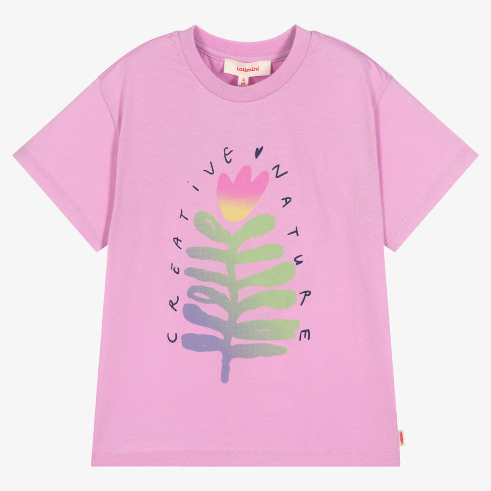 Lilac pink T-shirt for girls by Catimini, made in soft cotton jersey. This easy-to-wear style has a colourful flower printed on the front with 'Creative Nature' printed around it.