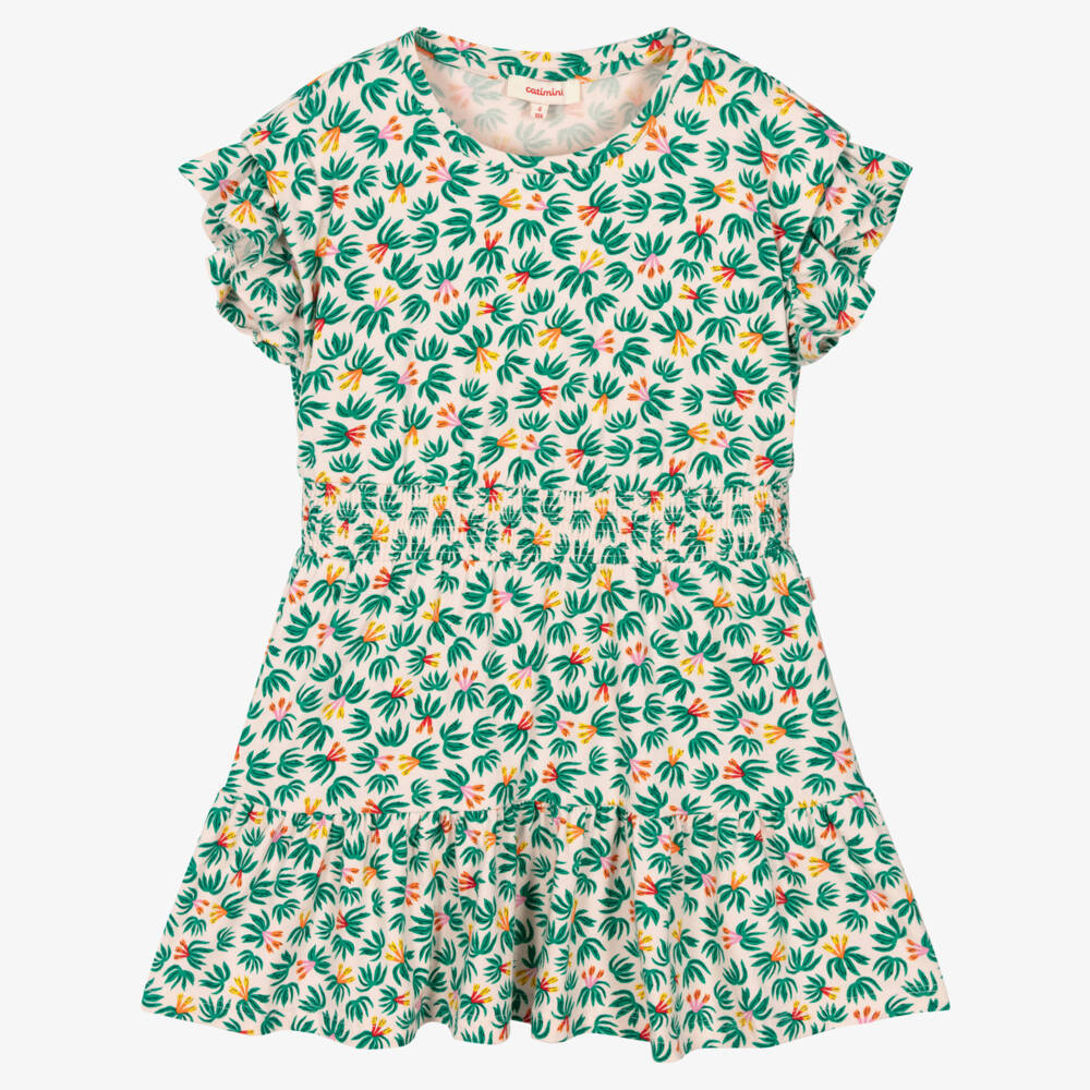 Pretty pale pink cotton dress for girls by Catimini with a bold green floral print. Made in soft, comfortable jersey, it has a gently elasticated waist, flared skirt and sweet ruffle sleeves. There is a small logo tab sewn in one side seam for an extra branded touch.