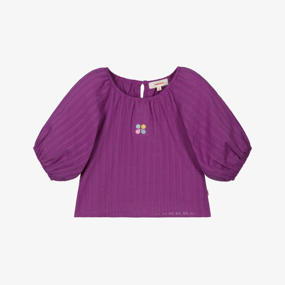 In a lovely deep purple shade, this sweet blouse for girls is by Catimini. Made in soft and lightweight cotton with a pretty, embroidered striped effect, it features voluminous puffed sleeves and has a colourful, embroidered floral motif on the front. It has a small logo tab on one side seam and a keyhole button fastening on the back.