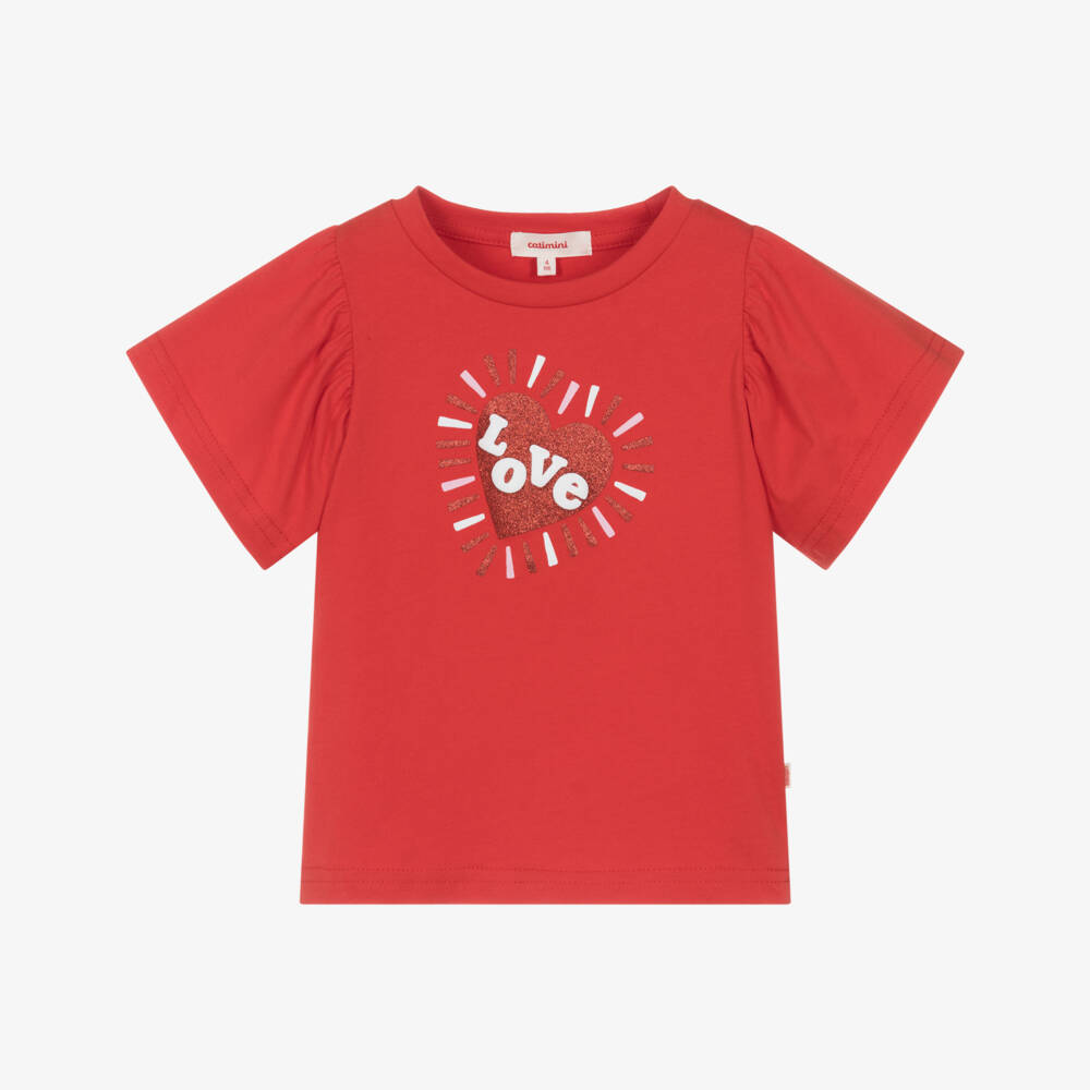 Red cotton T-shirt for girls by Catimini, with a glittering red love heart motif on the front. Made from soft jersey, it offers comfort and breathability for warm days. Short, ruffled sleeves elevate the design, making it a versatile and vibrant addition to her casual wardrobe.