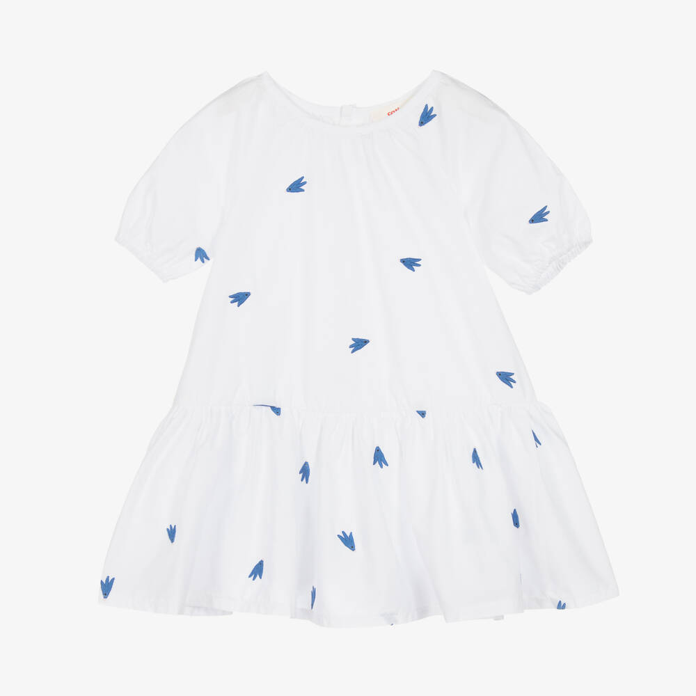Lovely white cotton dress for little girls by French brand Catimini, patterned with sweet birds, embroidered in blue. Great for warm days, it is loose-fitting and made in lightweight poplin, with full, raglan sleeves that have gently elasticated cuffs. The dress has a dropped waist with a gathered skirt below and a logo tab on one side seam. It fastens with buttons around the back.