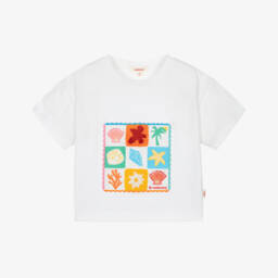 Girls eye-catching white cotton T-shirt by Catimini, with bold orange, pink and blue flowers embroidered and printed on the front. Casual and comfortable, it is made in soft jersey and has a large embroidered yellow logo for instant brand appeal.