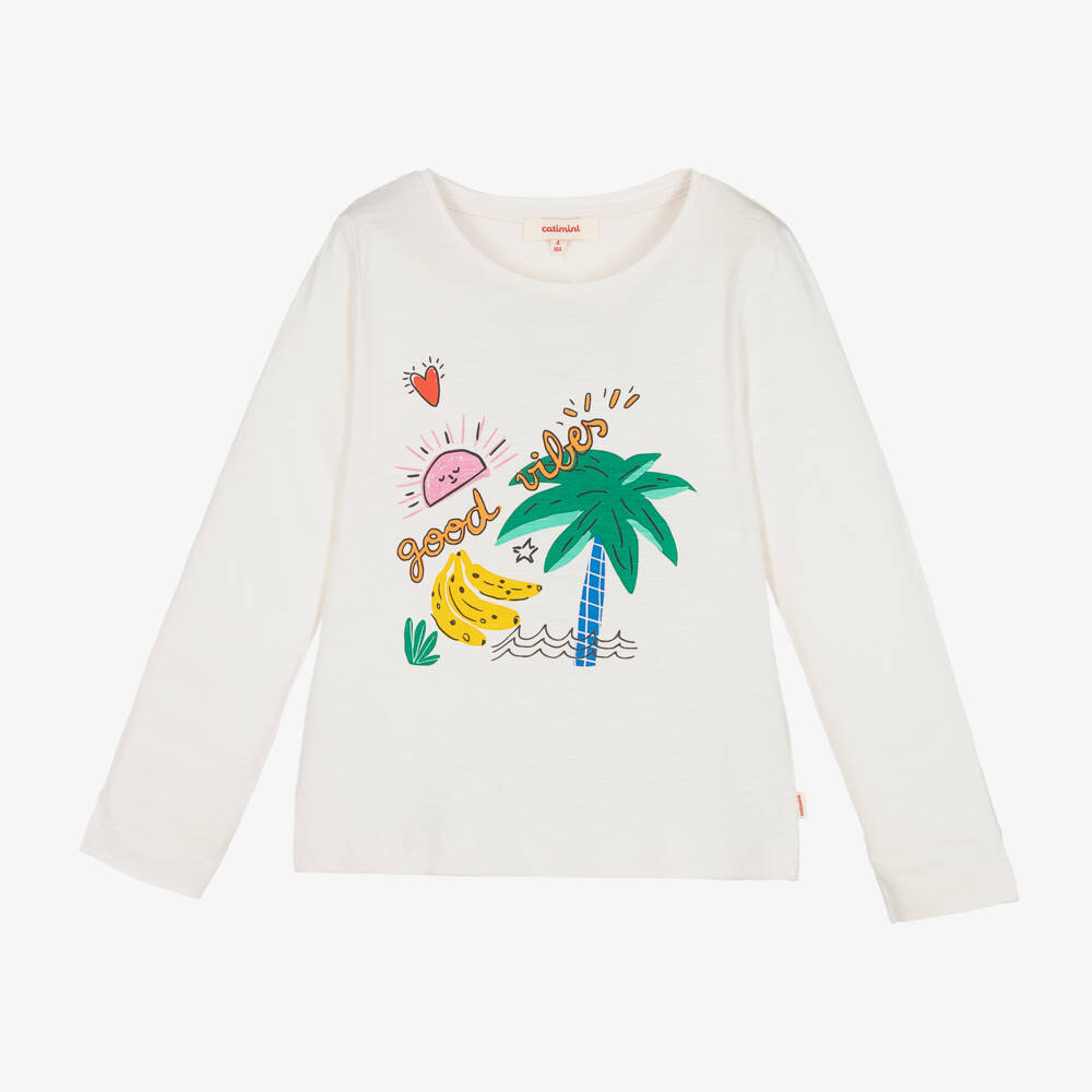 White cotton top for girls by French brand Catimini, with a fun, holiday feel. Made in lightweight, slub cotton jersey, it has a colourful palm tree and banana print, with the words 'good vibes'. The designer's logo tab is sewn on one side seam.
