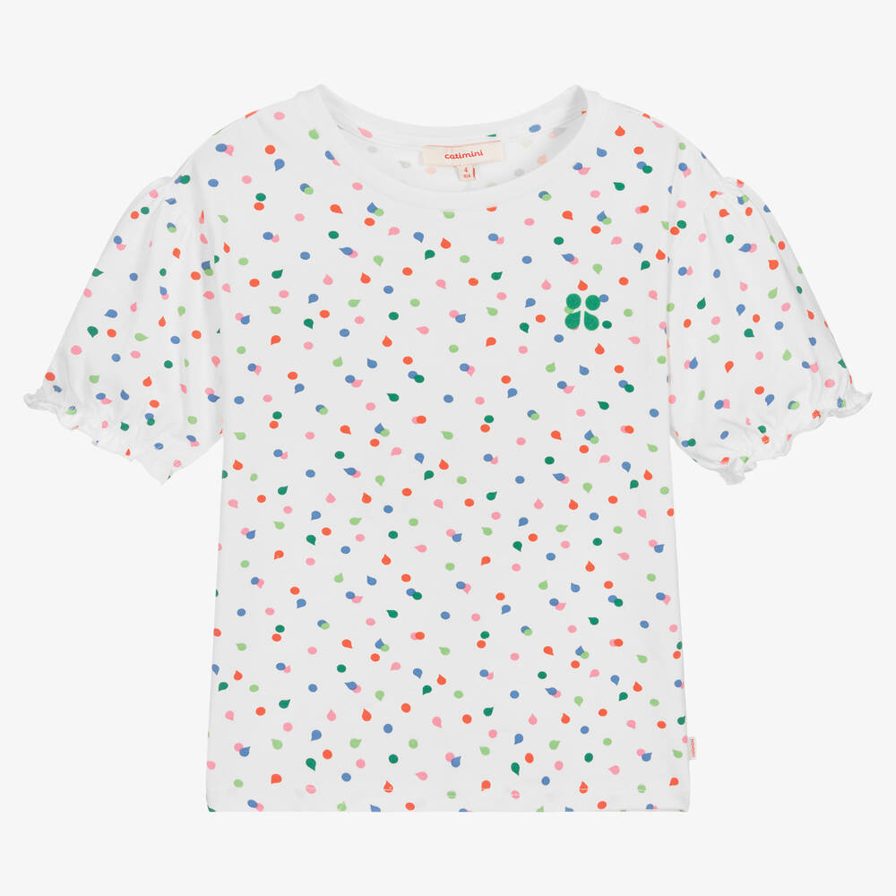 A lovely off-white T-shirt for girls by Catimini, made from soft cotton jersey. For easy styling, this casual piece is designed in a multicoloured polka dot print with scattered teardrop shapes and a textured green logo on the chest. Elasticated at the cuffs, the short puff sleeves gently gather on the seam for a girly silhouette. 30% minimum of the fibres in this product are recycled.