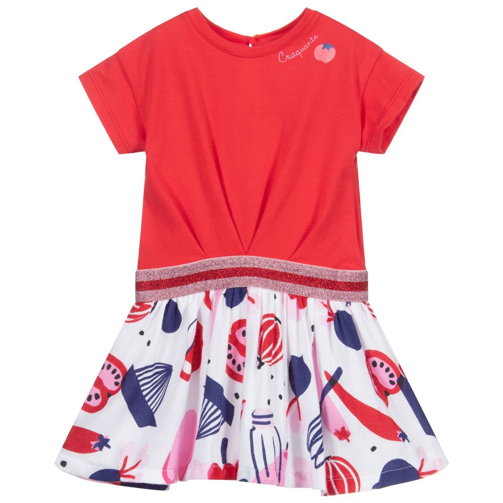 Little girls dress by Catimini, with a red cotton jersey bodice and a white, woven feel cotton skirt with colourful kitchen themed print. There is glittery apple print on one shoulder with the words' Craquante' meaning 'adorable'. The elasticated waist is trimmed with a glittery pink and red band