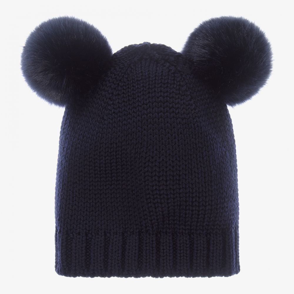 Navy blue knitted hat for girls, by Catya. Made from beautifully soft Merino wool, it has two navy blue faux fur pom-poms on the top.