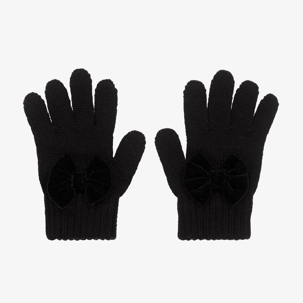 Girls Black Wool Knit Bow Gloves