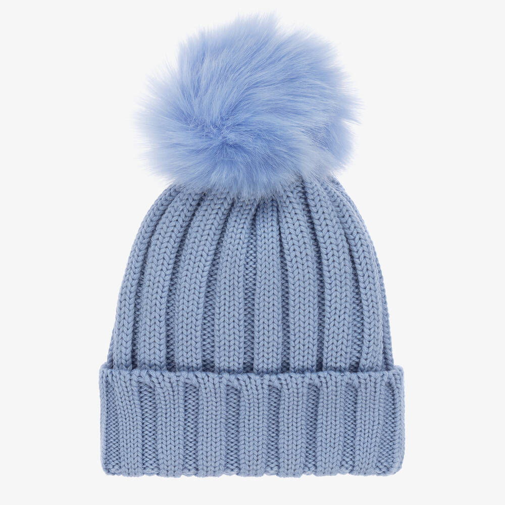 A chunky ribbed knit pale blue hat for girls by Italian brand Catya, with a gorgeous oversized pom-pom in plush faux fur. Cosy and warm, it is made in luxuriously soft Merino wool, with a turned-up brim.