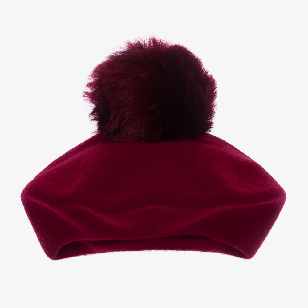 Girls burgundy red beret by Italian brand Catya, made in soft felted Merino wool. A timeless way to finish an outfit, this structured beret has a traditional silhouette with a large red faux fur pom-pom on the top.